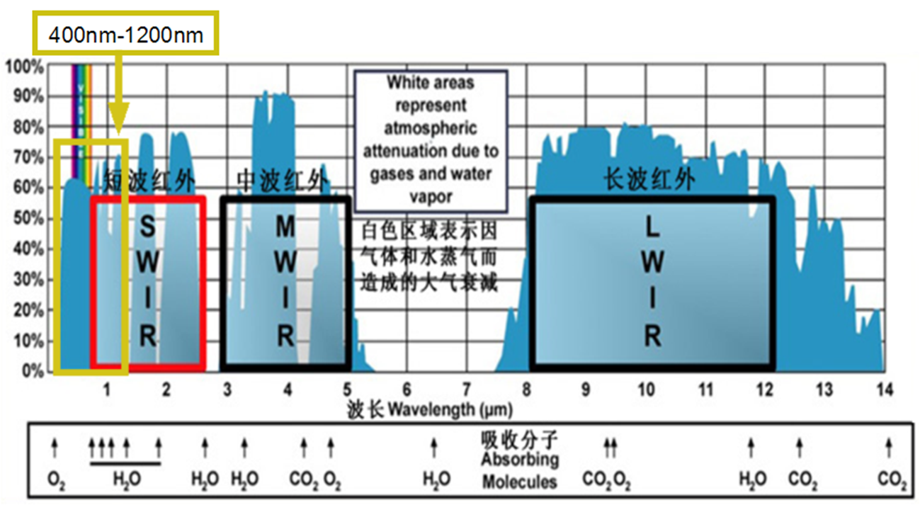 目前采用的探测器谱段如下图黄色框中所示:用CMOS来实现,其优点为连续工作时间长、功耗小,容易开发出更高分辨率的芯片。