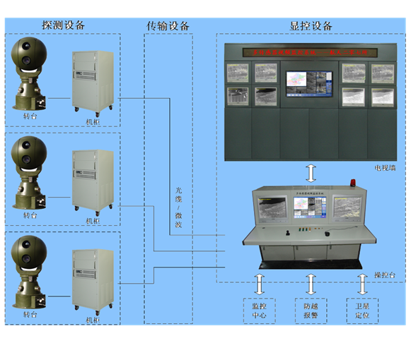 主要用于地面和低空目标昼夜监控,可与防越报警、卫星定位等系统联动。并可形成多级指挥调度体系和态势评估体系。系统探测设备包含长焦高清摄像机、高分辨率红外热像仪和高精度转台,可进行360°全视场扫描,并进行全景拼接,实现态势掌控的全局化。
